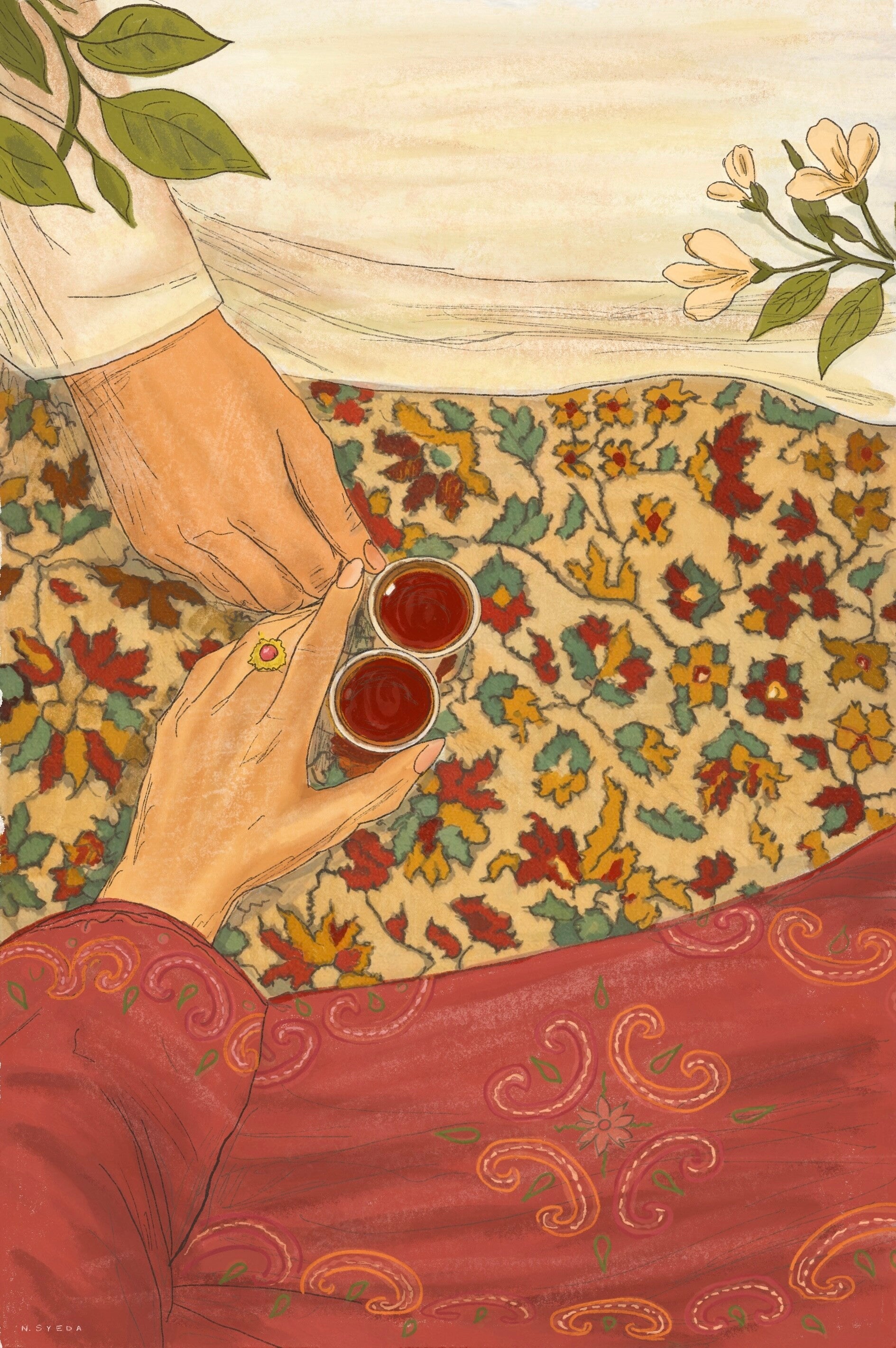 A quiet exchange captured in warmth and pattern. Two hands meet over small cups of tea — a simple ritual, transformed into an intimate gesture of devotion. Inspired by South Asian textiles and the poetry of everyday moments, this piece honours love in its gentlest form.