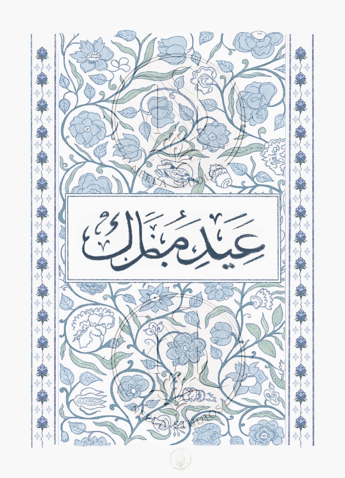 Rendered in soft blue and green tones, the composition echoes the ornamental gardens and manuscript patterns found throughout Islamic art, creating a piece that feels both timeless and celebratory.